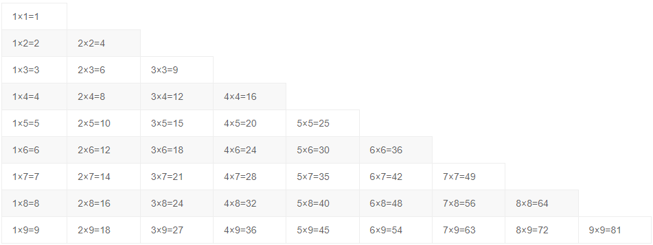 一九得九 二九十八 三九二十七 四九三十六 五九四十五 六九五十四 七九六十三 八九七十二 九九八十一
